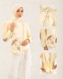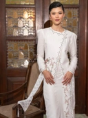 JATI JANGGAN, Kebaya Janggan dengan siluet modern yang sturctured namun tetap feminin. Menggunakan bahan viscose dobby dengan motif geometris, texture ringan dan halus. Dilengkapi dengan cross stitch embroidey menjadi aksen utama dengan warna broken white yang elegant dan timeless.
