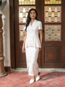 CITRA AYU SKIRT, Asymmetric span dengan design modern yang memberikan siluet feminin dan elegant. Menggunakan material silk premium yang ringan dan halus. Cocok digunakan untuk pairing dengan kebaya ataupun piece product lain untuk acara formal dan semi formal.